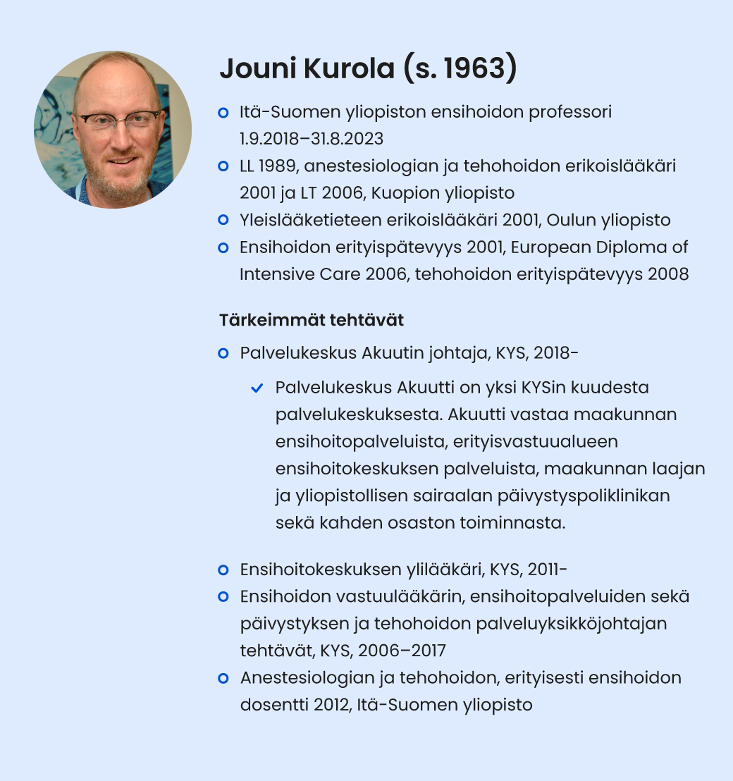 Ylilääkäri Jouni Kurola: “Mikäli tieto ei kulje, voi potilaan hoito pysähtyä”.
