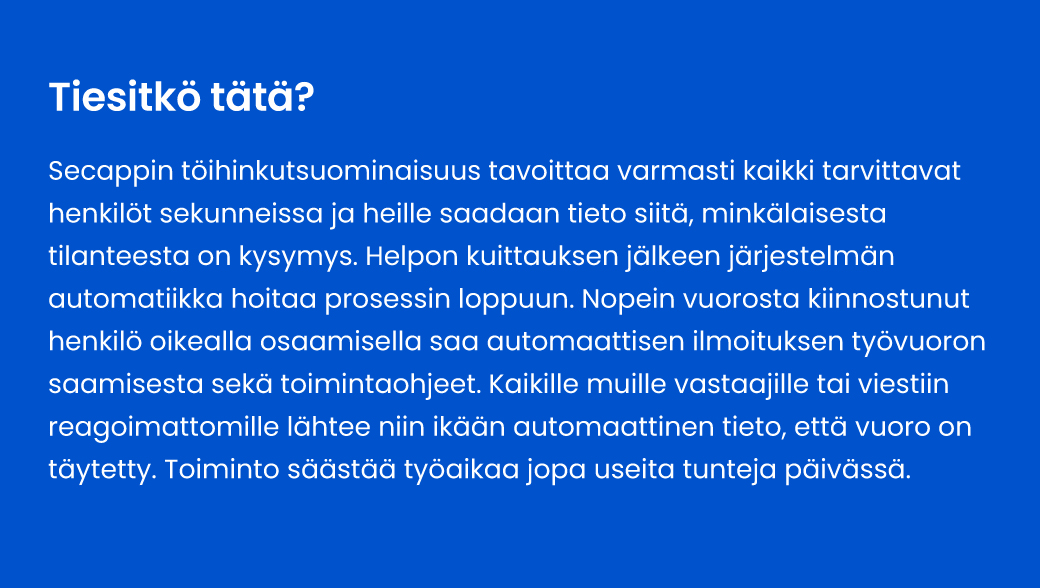 “Halusimme uudistaa toimintaamme niin, että viestintäratkaisu oli jotakin muuta kuin pelkkä yksisuuntainen hälytysjärjestelmä, ja että se tarjoaa kattavat vaihtoehdot nykyaikaisen tiedonvälitykseen käyttöön. Perinteinen tekstiviestijärjestelmämme korvattiinkin Secappilla, jota käytämme niin arjen töihinkutsuissa kuin esimerkiksi häiriötilannehälyttämisessä”, Kurola kertoo.