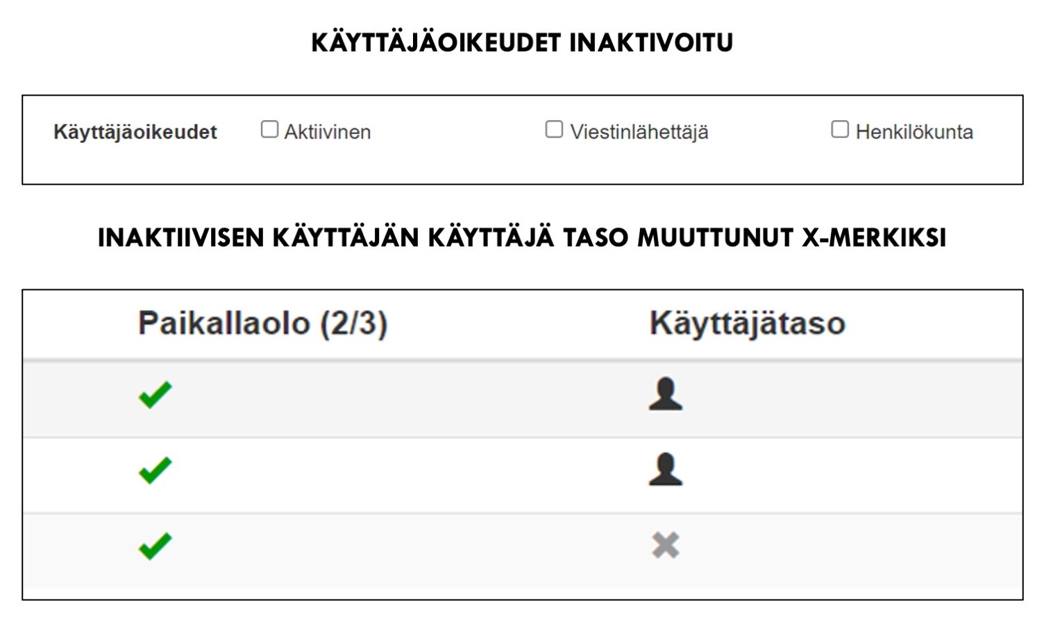 Vinkki: Käyttäjän aktiivisuutta/inaktiivisuutta voidaan käyttää myös käsin tehtävässä käyttäjien ylläpidossa. Mikäli joku käyttäjä on esimerkiksi pidempään organisaation toiminnasta pois, voidaan hänet inaktivoida myös Secappista. Käyttäjäprofiili voidaan aktivoida jälleen, kun henkilö palaa takaisin.