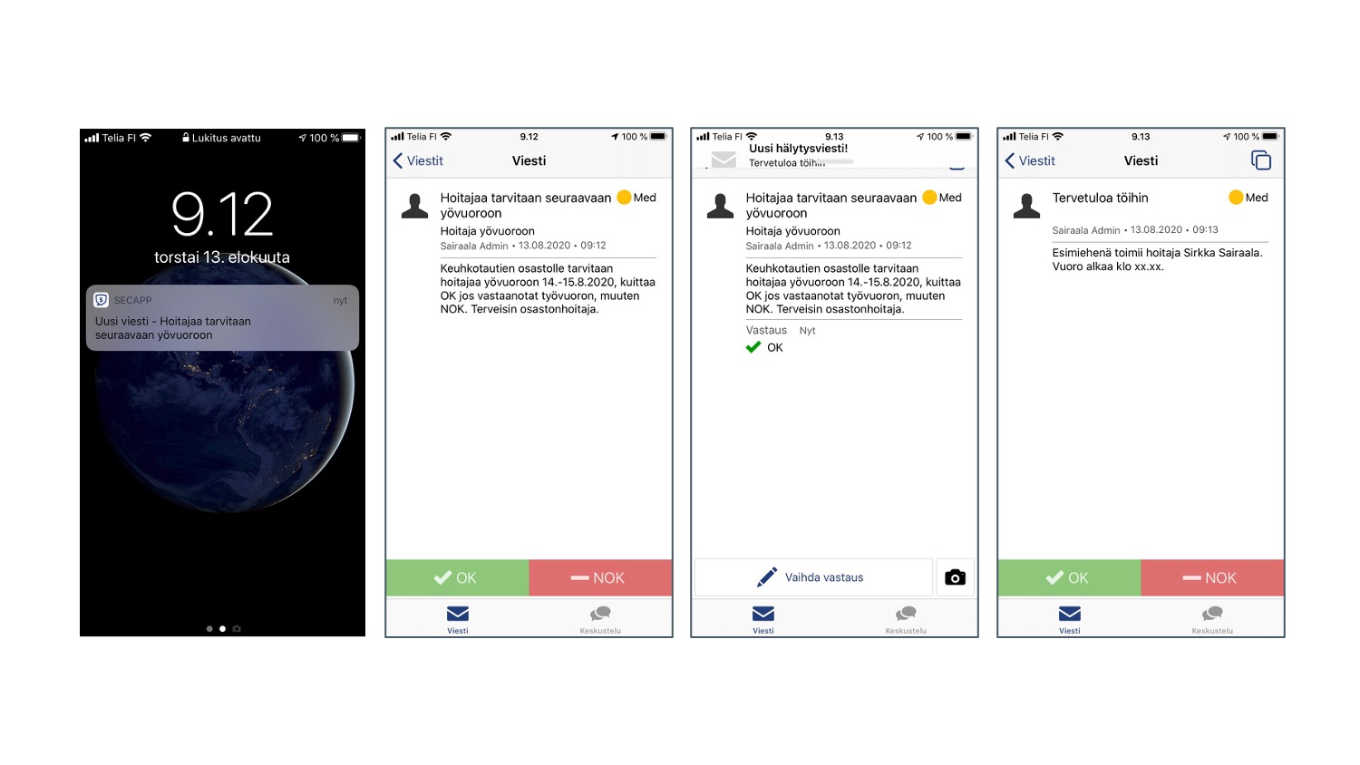 - Samalla OK:ta painanut hoitaja saa automaattisella Secapp-viestillä lisää tietoa tulevasta vuorosta ja esimerkiksi ohjeet siihen liittyen