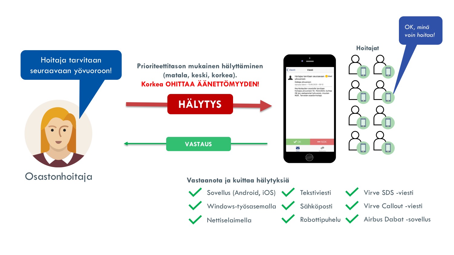 - Nopea kaksisuuntainen viestintä: lähettäjä tietää reaaliajassa vastaukset ja automaatio hoitaa jatkokuittaukset niin työvuoroon valitulle kuin niille, joita ei valittu