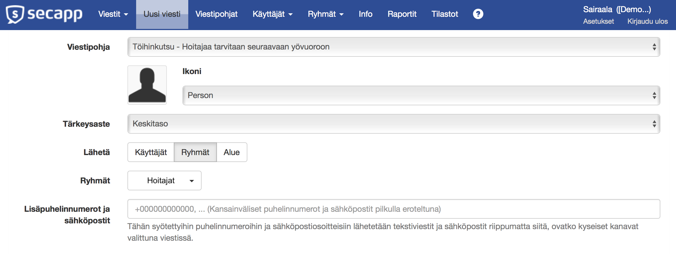 - Kiireellisissä tapauksissa viestille voidaan asettaa korkein prioriteetti, joten se menee perille kovaäänisen soittoäänen kanssa, vaikka vastaanottajilla olisi oma puhelin äänettömällä