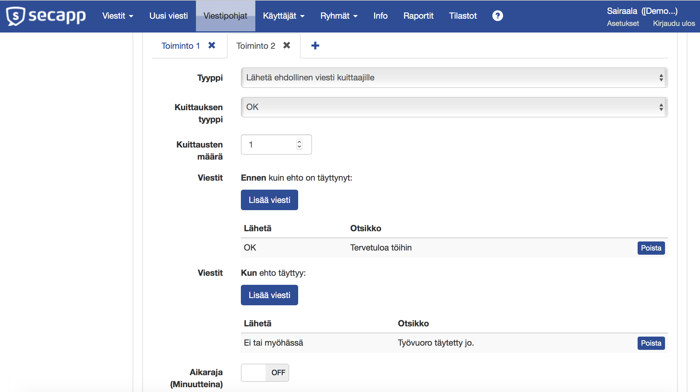 - Tässä viestissä asetukset määritellään niin, että kun ensimmäinen hoitaja vastaa työvuorokutsuun OK, niin hänelle lähtee automaattinen ”tervetuloa töihin”-viesti