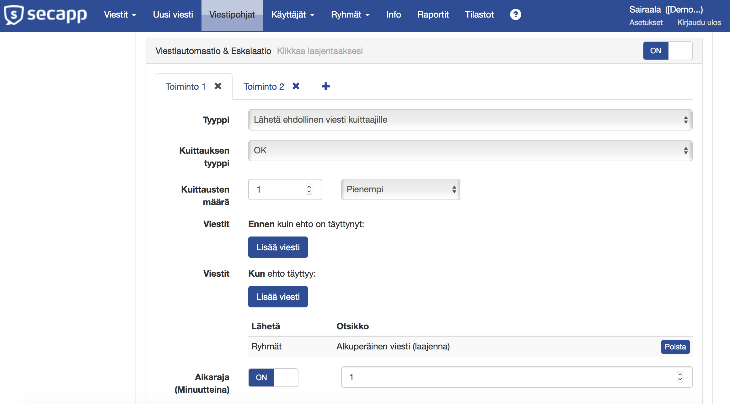 - Seuraavaksi määritellään viestiautomaatio ja eskalaatio eli ne tekijät, joilla kutsuprosessi hoituu asetusten ja viestin lähettämisen jälkeen itsestään loppuun asti automaattisesti