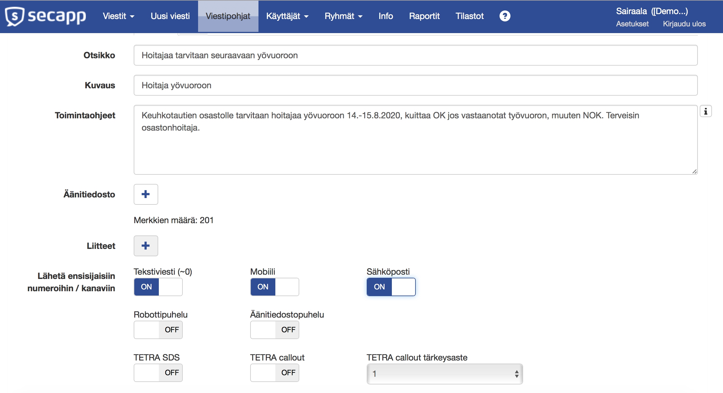- Tässä esimerkkipohjassa prioriteetiksi on määritelty keskitaso (soittoääni ja näyttöilmoitus vastaanottajan laitteessa, ei ohita äänettömyyttä)