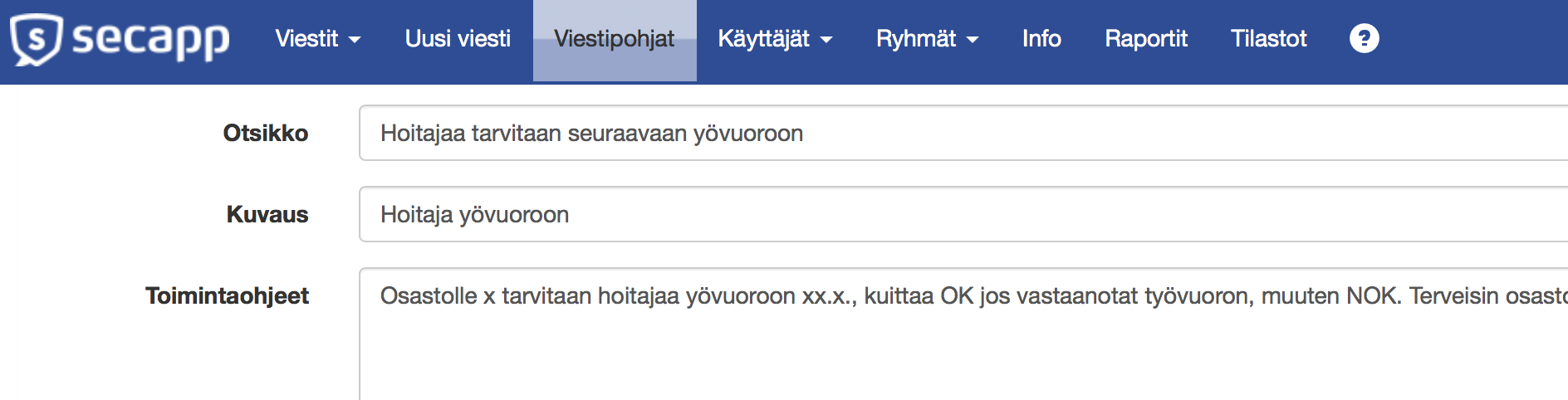 - Ensimmäiseksi luodaan töihinkutsuviestiä varten viestipohja Secappiin