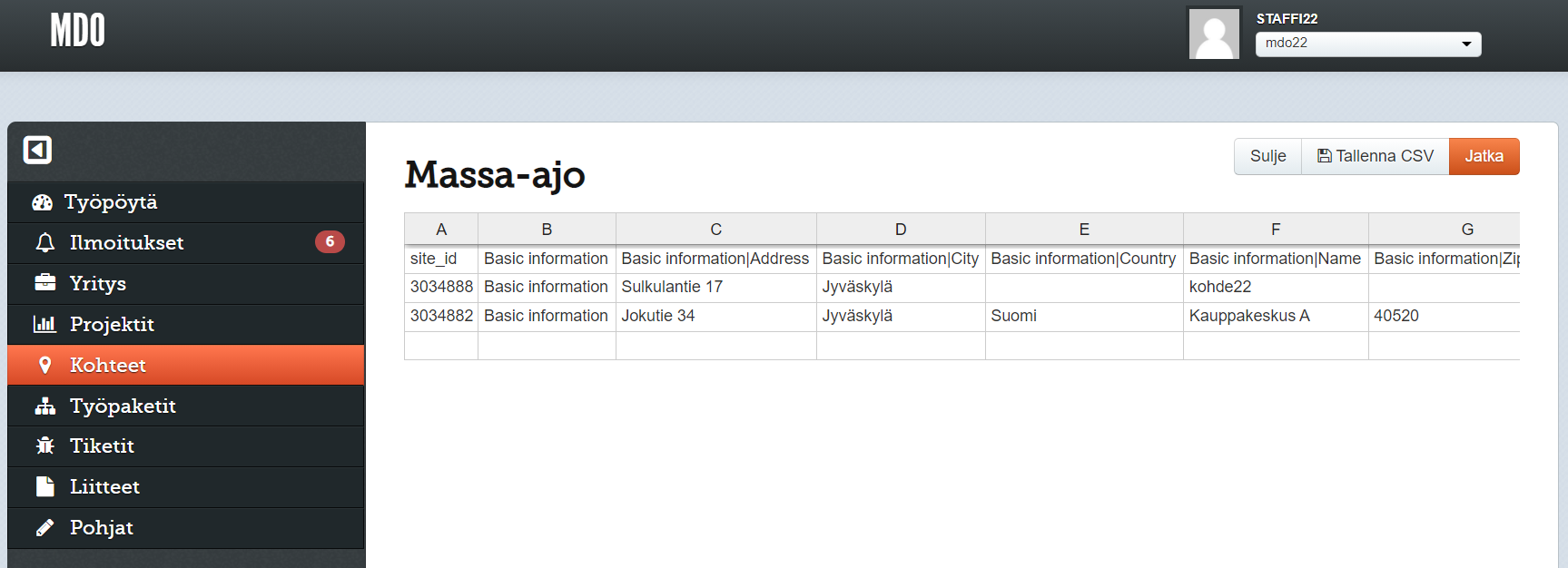 Tuo tiedostosta -toiminnolla voidaan tuoda Massa-ajolla ajettavat muutokset CSV-tiedostosta. Tämä toimii hyvin Massaraportti-toiminnon kanssa (käsitelty osiossa Kohteet > Massatyökalut > Massaraportti / massa-ajo), sillä kyseinen toiminto mahdollistaa raportin lataamisen CSV-tiedostona. Luotu CSV-tiedostoa voidaan sitten muokata taulukkolaskentaohjelmistossa, jonka jälkeen muokatut tiedot voidaan suorittaa tuomalla kyseinen CSV-tiedosto takaisin järjestelmään.