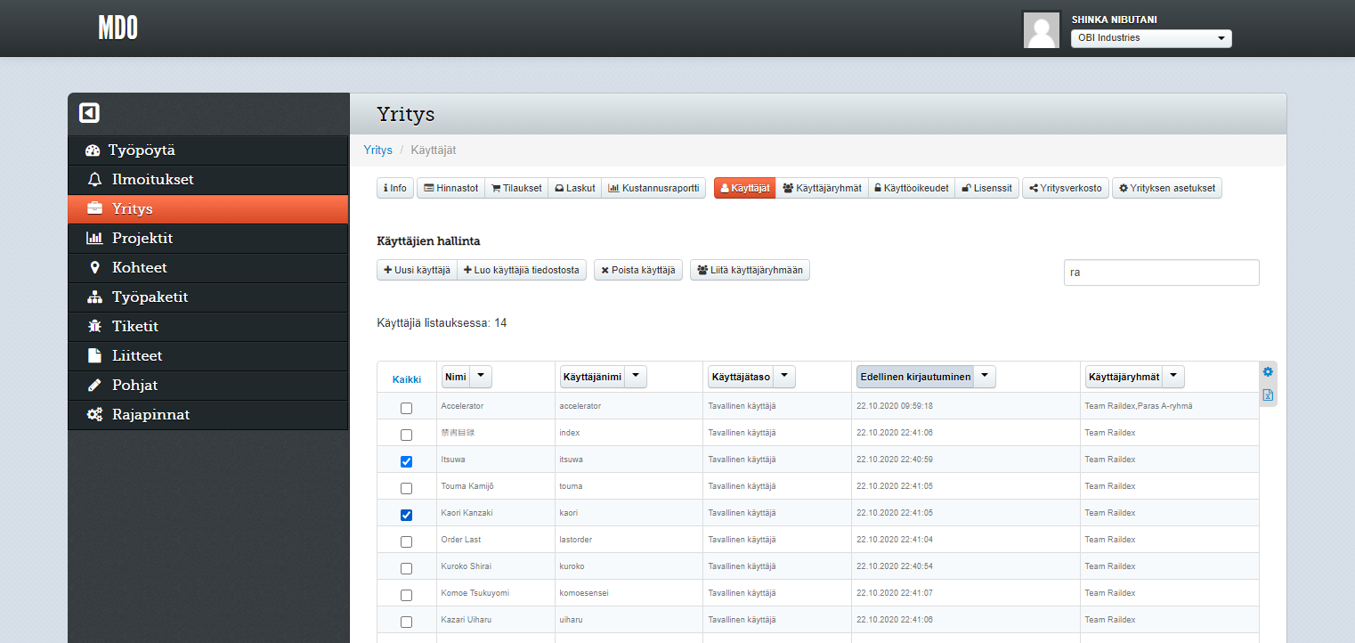 - Haku: Käyttäjälistan suodattaminen halutulla tekstihaulla.