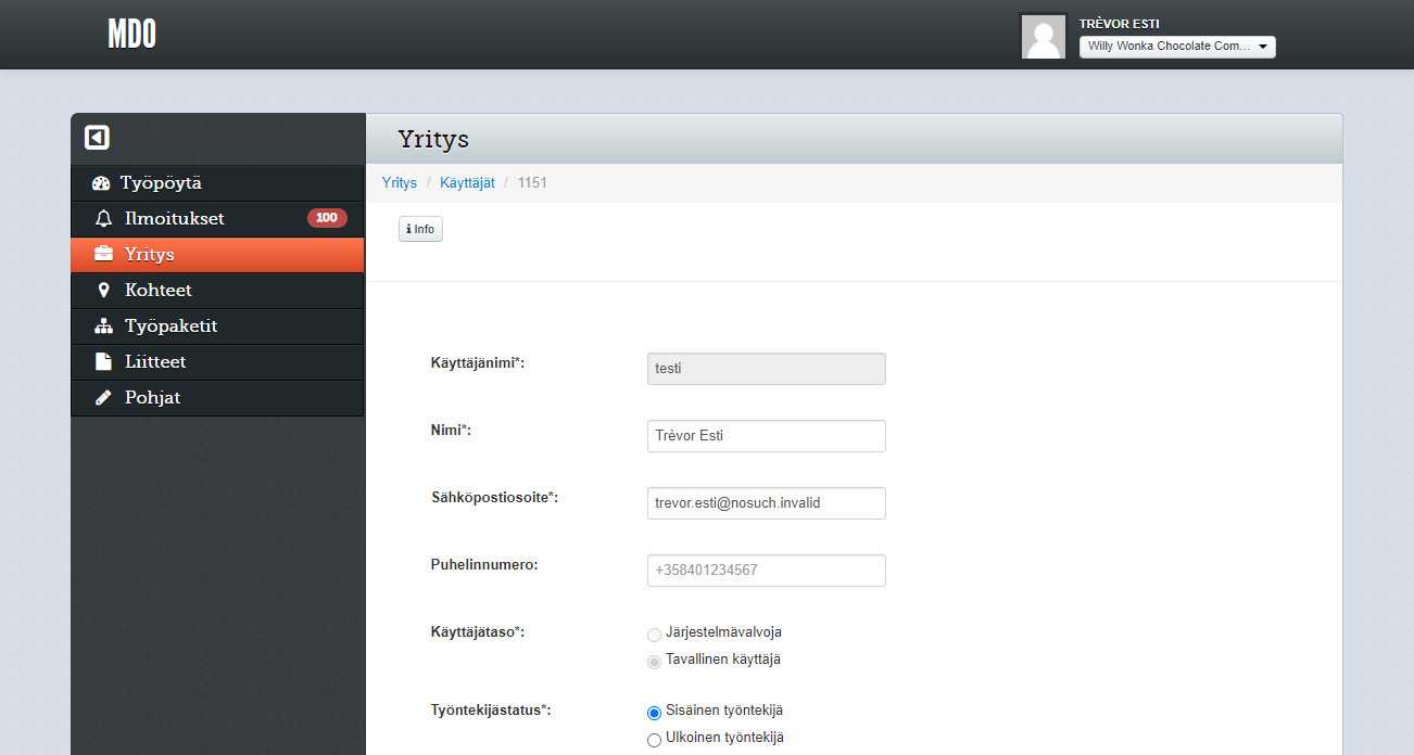 - Työntekijästatus: Valinta ilmaisee, onko käyttäjätunnus organisaation oman henkilön, vai jonkun muun henkilön, käytössä.