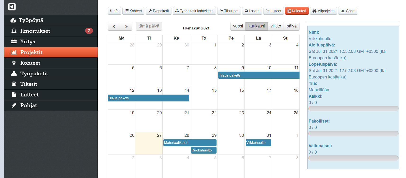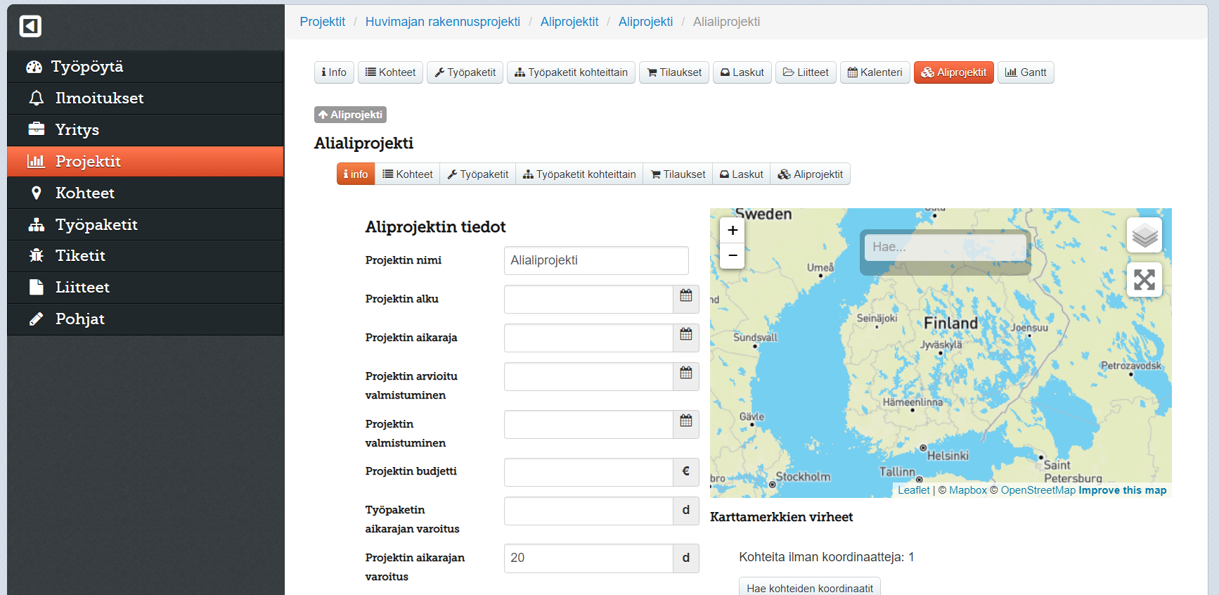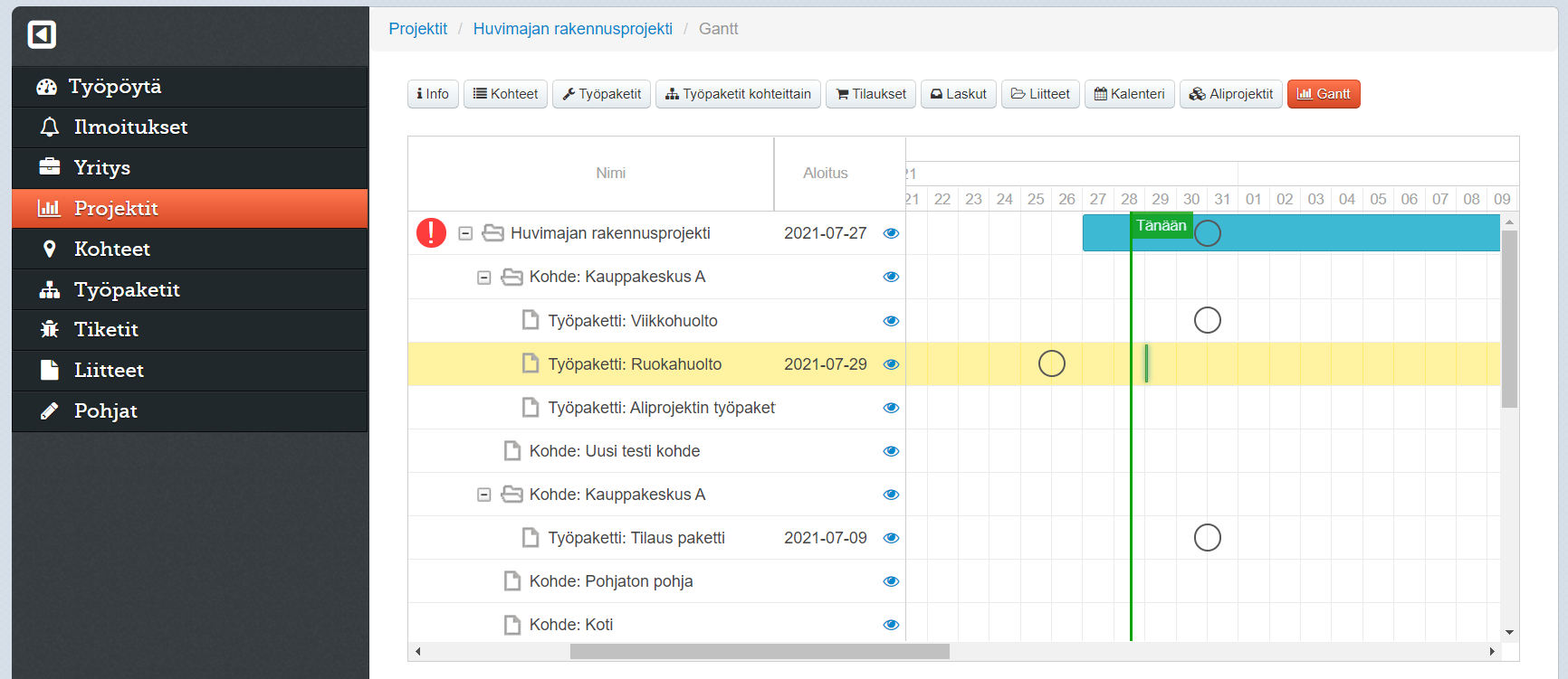Kirjauduttuasi sisään aukeaa Työpöytä-näkymä, jolla esitetään yhteenveto organisaatiosi työpaketeista, kohteista, projekteista, tilauksista ja laskuista.