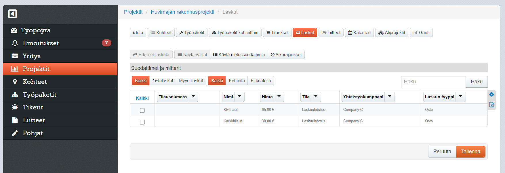 - Tilaukset ja laskut: Organisaation tilaukset ja laskut tai osa niistä.
