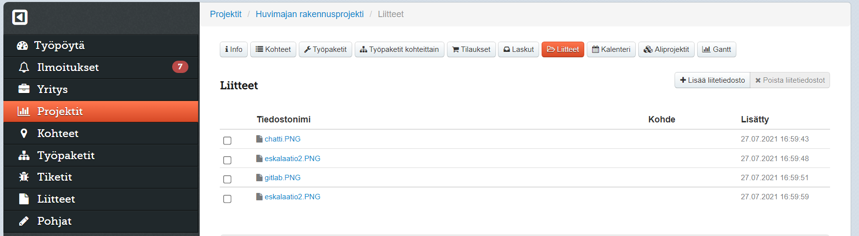 - Liitteet: Liitteet-päänäkymässä näkyvät liitteet tai osa niistä.