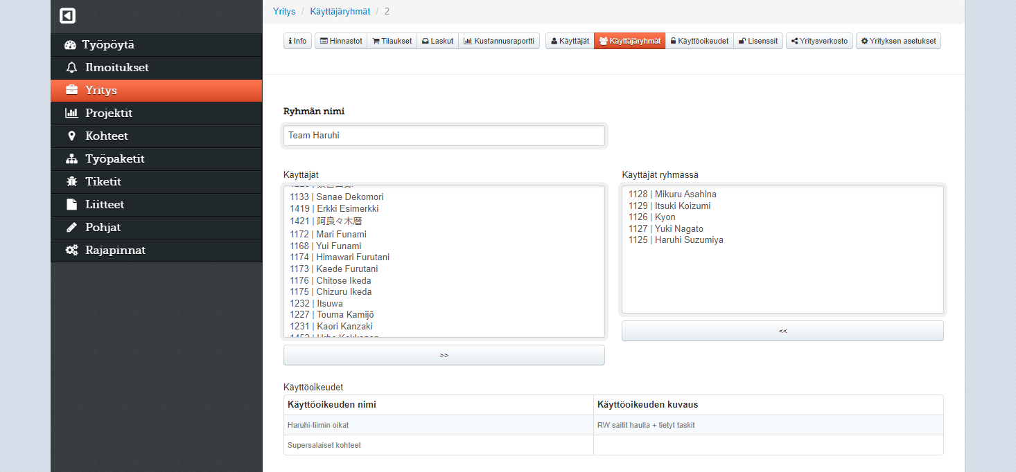 Käyttäjäryhmiä voidaan käyttää yksittäisten käyttäjien sijaan esimerkiksi työpaketin työntekijöinä tai käyttöoikeuksien kohteena. Ryhmiä ja näiden kokoonpanoja hallitaan Käyttäjäryhmät-näkymässä.