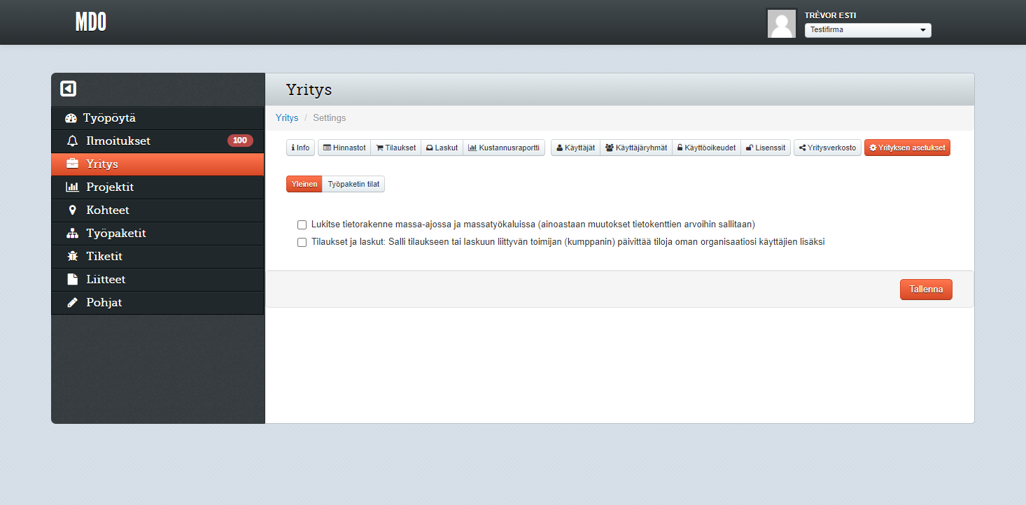 Koko organisaatiota koskevat asetukset ja määritykset ovat sivuvalikon Yritys-valinnasta aukeavan Yritys-kokonaisuuden alla. Samasta paikasta löytyvät myös hinnastot, tilaukset, laskut, kustannusraportti ja yritysverkosto, jotka on kuvattu myöhemmin tässä oppaassa.
