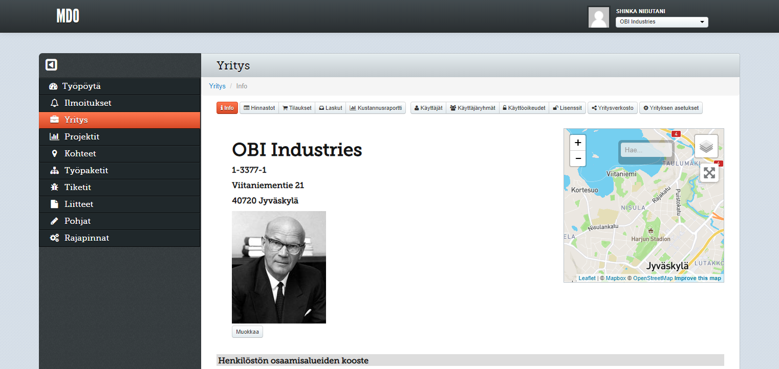 Oletuksena Yritys-näkymistä näytetään Info-näkymä, joka sisältää organisaation perustiedot (nimen, osoitteen, Y-tunnuksen, jne) sekä koosteen käyttäjille määritellyistä osaamisista.