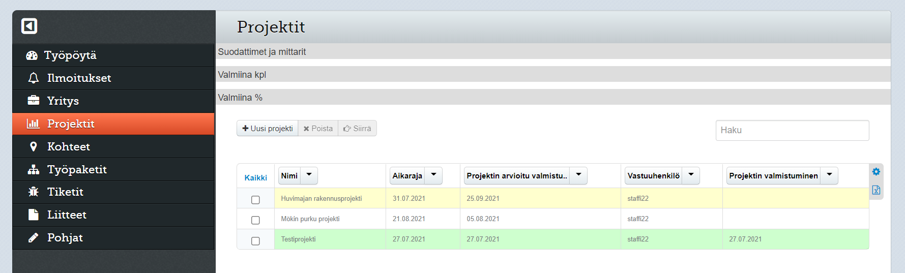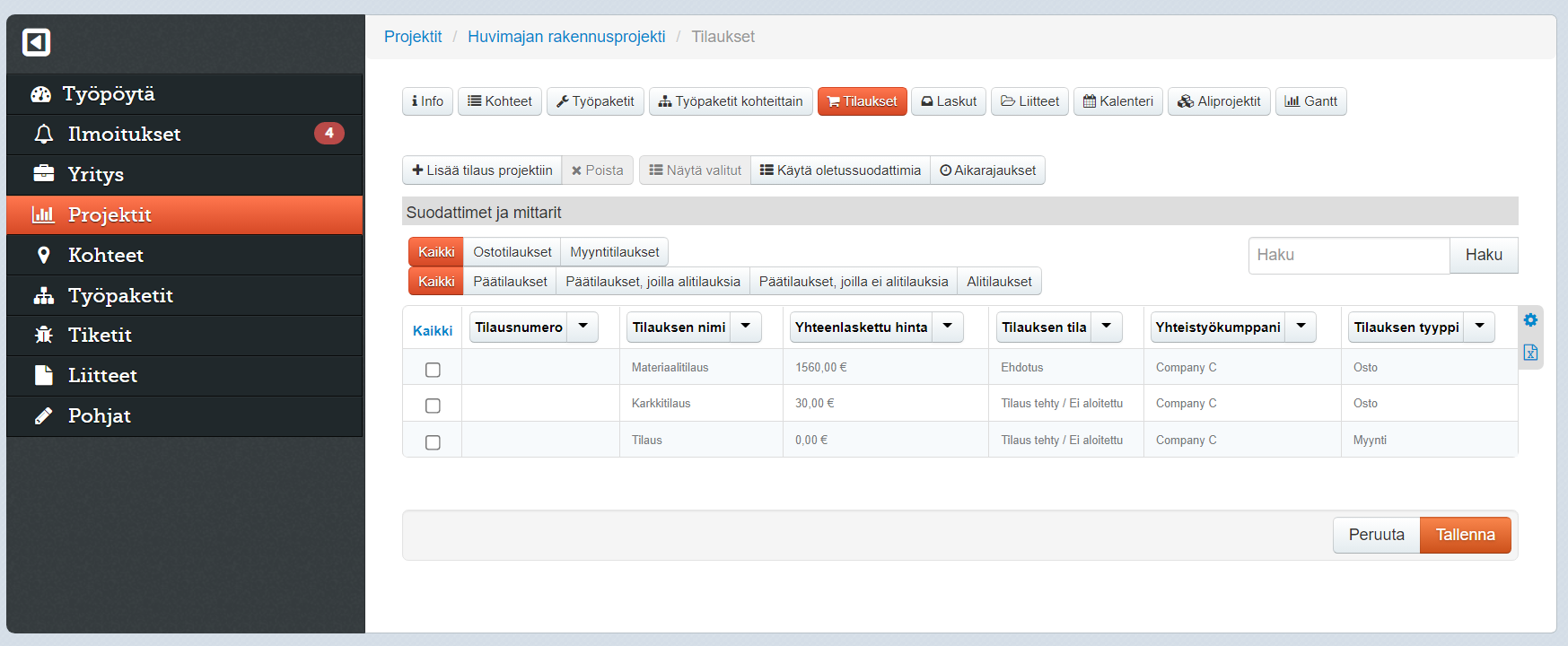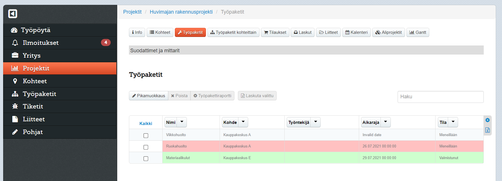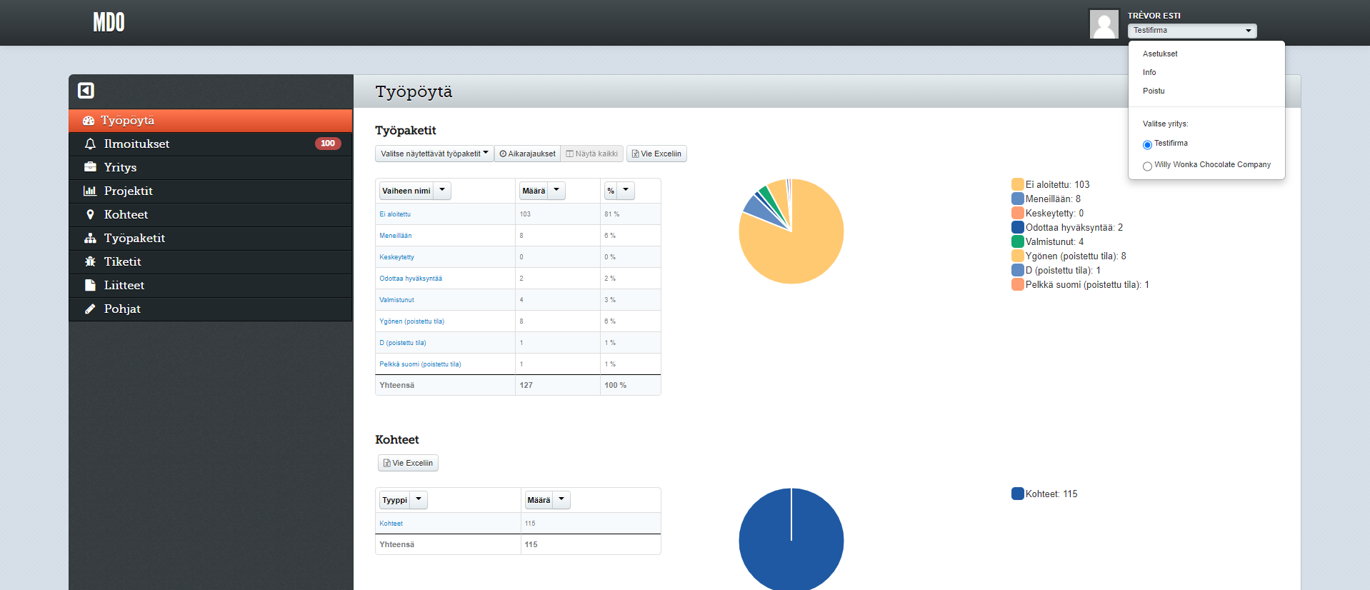 Kirjauduttuasi sisään aukeaa Työpöytä-näkymä, jolla esitetään yhteenveto organisaatiosi työpaketeista, kohteista, projekteista, tilauksista ja laskuista.