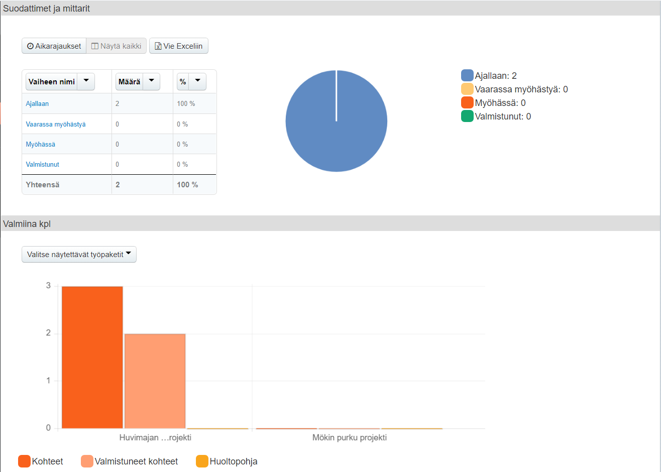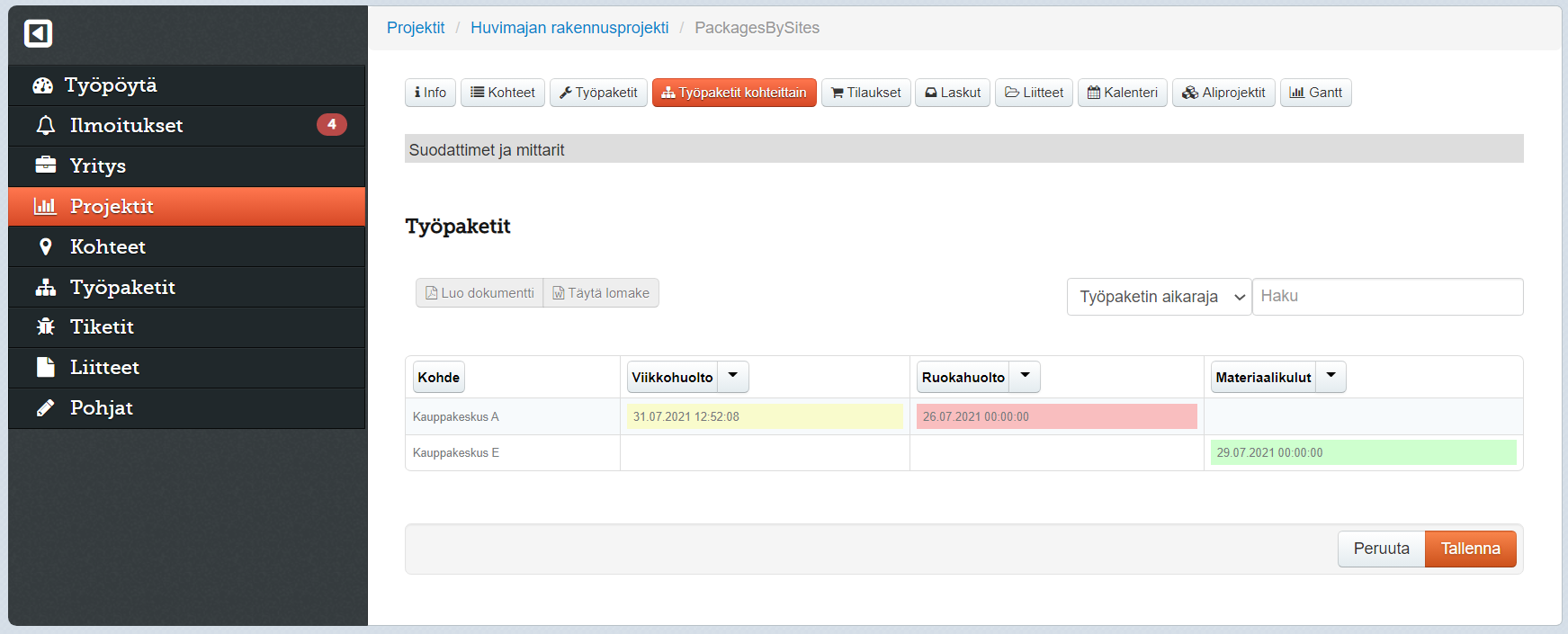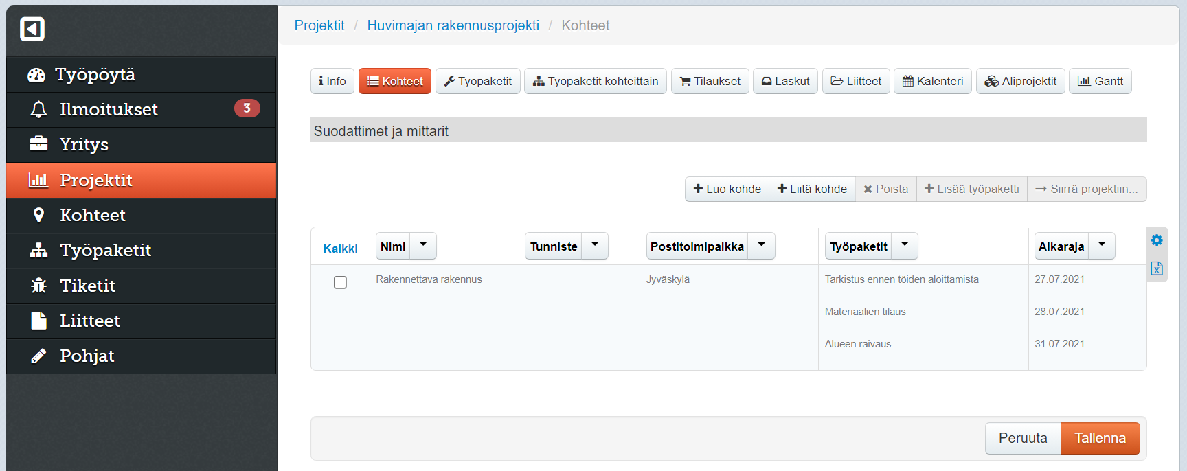Kirjauduttuasi sisään aukeaa Työpöytä-näkymä, jolla esitetään yhteenveto organisaatiosi työpaketeista, kohteista, projekteista, tilauksista ja laskuista.
