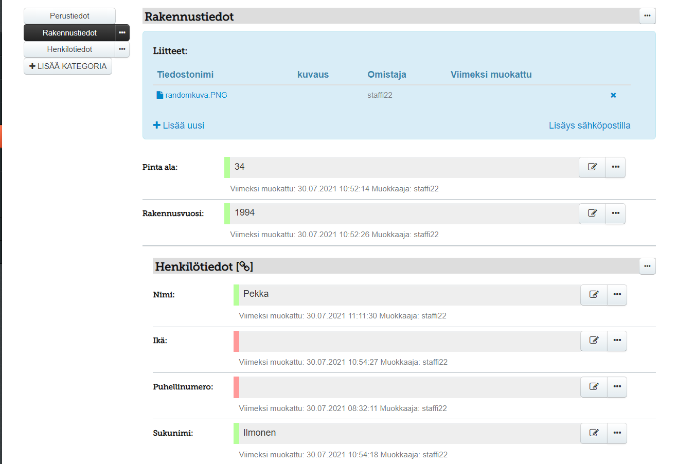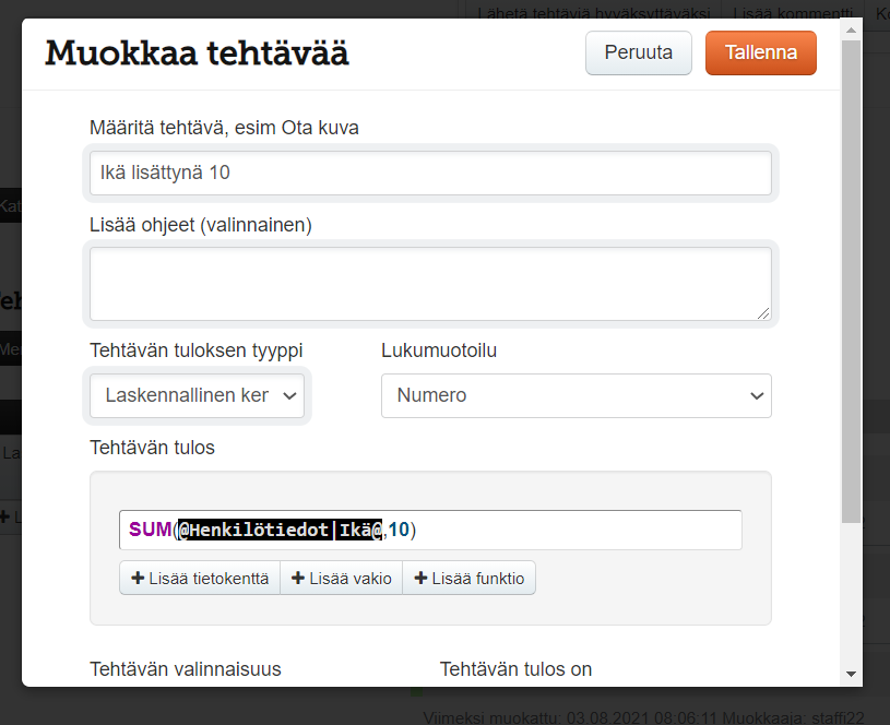 - Muokkauspäivämäärä: Aika jolloin tikettiä viimeksi muokattiin. Päivittyy automaattisesti.