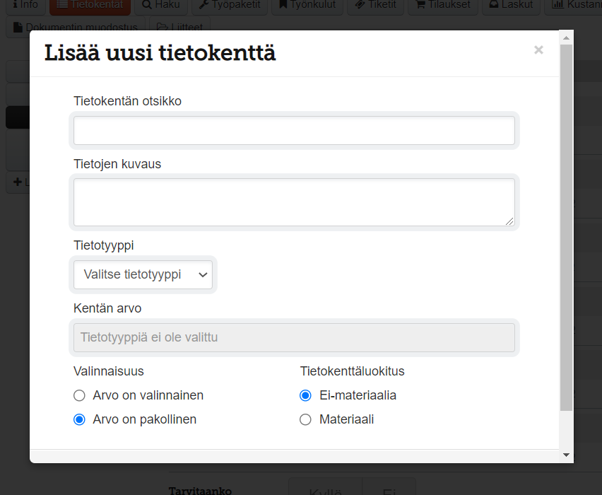 Työtehtävän työnkulun seuraamiseksi tulee luoda työkortti käyttäen Uusi työkortti -toimintoa. Työkorttia luodessa voi asettaa seuraavat tiedot: