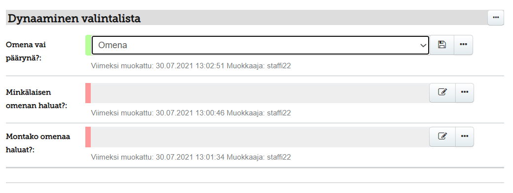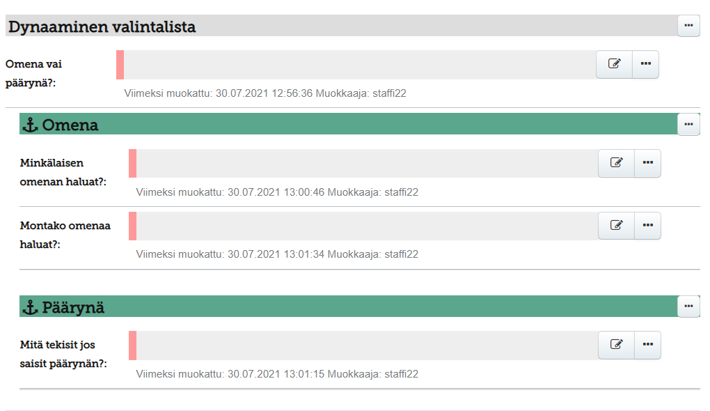 - Uusi valintalista tiedostosta: Luo uuden valintalistan käyttäen vaihtoehtoina annetun tiedoston sisältöä niin, että yksi rivi on yksi vaihtoehto. Valintalistan luonnin jälkeen avaa Valintalistan muokkaus -näkymän, jossa voi vielä varmistaa, että vaihtoehdot ovat oikein, jolloin niitä voi vielä muokata.