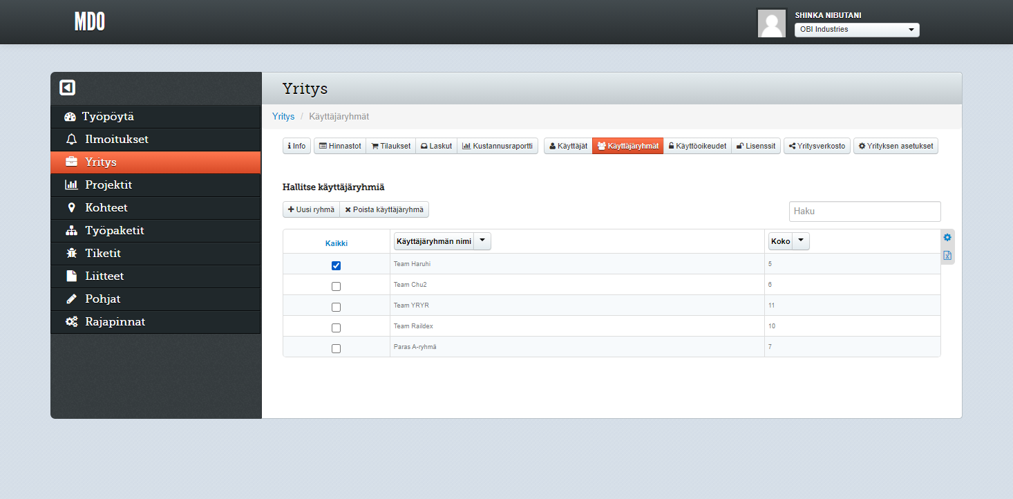 Käyttäjäryhmiä voidaan käyttää yksittäisten käyttäjien sijaan esimerkiksi työpaketin työntekijöinä tai käyttöoikeuksien kohteena. Ryhmiä ja näiden kokoonpanoja hallitaan Käyttäjäryhmät-näkymässä.