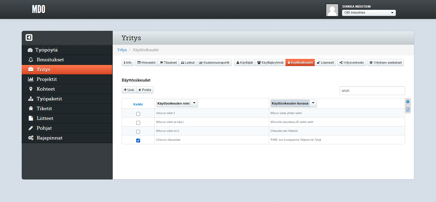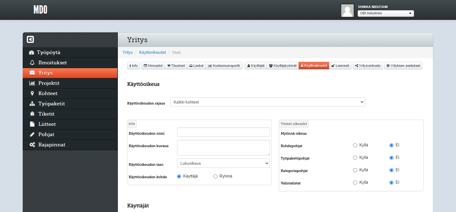 Napsauttamalla käyttöoikeuden riviä se avataan muokattavaksi. Myös uuden käyttöoikeuden luonti tapahtuu samassa näkymässä.