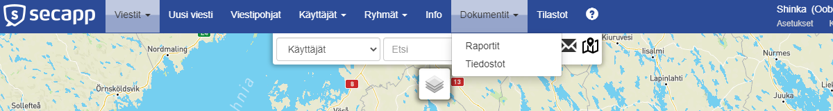Jos organisaatiollasi on käytössä myös Secapp-viestintätoiminnallisuudet, voit siirtyä MDO:hon myös suoraan Secappin kautta valitsemalla Secapp-yläpalkista Raportit. Riippuen organisaatiosi asetuksista, valinta voi olla myös nimellä Tiedostot, tai löytyä Dokumentit-pudotusvalikosta (kuten oheisessa kuvassa).