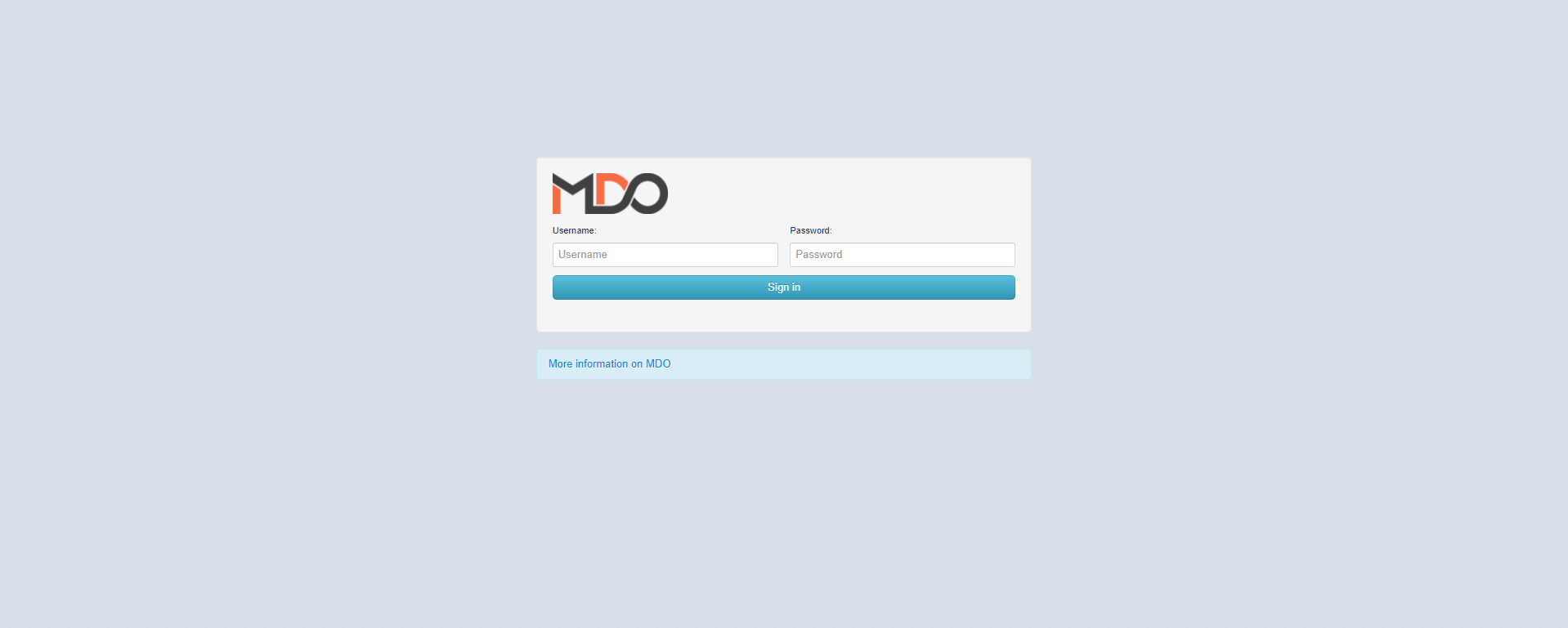 Jos et ole kirjautuneena sisään, avatessasi MDO:n selaimessasi aukeaa kirjautumisnäkymä. Syötä käyttäjätunnuksesi ja salasanasi näkymän Username- ja Password-kenttiin, ja napsauta Sign in kirjautuaksesi sisään.