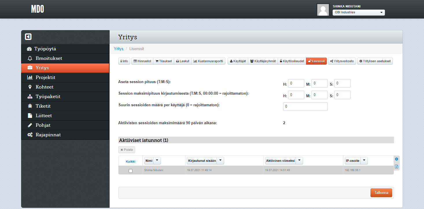 - Suurin sessioiden määrä per käyttäjä: Kenttään määritellään yhden käyttäjän samanaikaisten istuntojen suurin sallittu määrä. Jos raja ylittyy, kirjataan käyttäjän vanhin istunto ulos. Jos kenttä asetetaan nollaksi, ei käyttäjän yhtäaikaisten istuntojen määrää ole rajoitettu.
