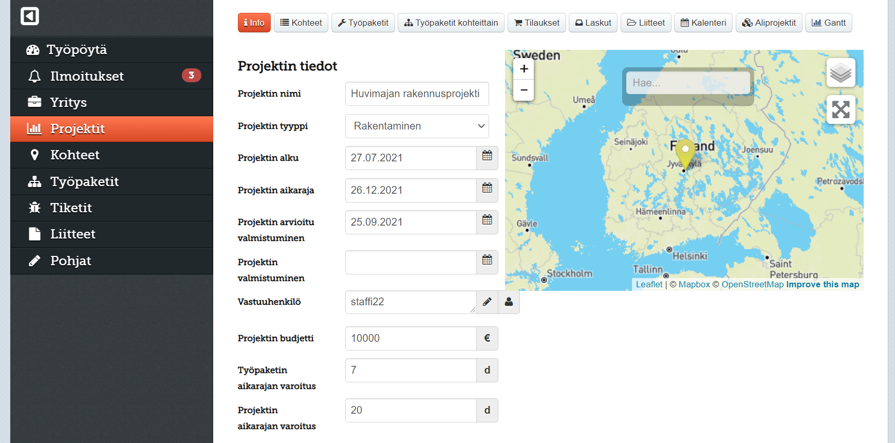 - Työpaketti: Työpaketti, jota työkortti vastaa tai muulla tavoin liittyy työkorttiin. Korttia varten voi luoda uuden työpaketin tai liittää jo olemassa olevan työpaketin.