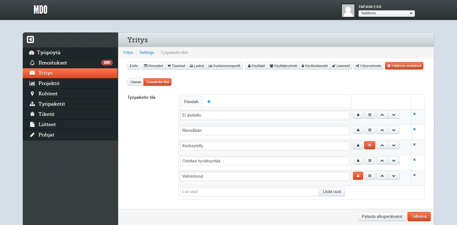 Voit siirtyä näkymien välillä vasemman sivupalkin kautta. Yksittäiset näkymät on kuvattu tarkemmin myöhemmin tässä oppaassa. Oikeassa yläkulmassa olevasta pudotusvalikosta pääset käyttäjäasetuksiisi, voit tarkastella tietoja MDO:sta, ja kirjautua ulos. Jos käyttäjätunnuksesi kuuluu useaan organisaatioon, voit siirtyä näiden välillä pudotusvalikon Valitse yritys -valinnoilla.